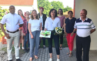 Anlässlich ihres 40-jährigen Dienstjubiläums überreichte Pfarrer Dr. Pius Adiele Frau Gisela Dreger in einer kleinen Feierstunde einen Blumenstrauß und bedankte sich für ihr Engagement und ihren Einsatz sowie ihre Verbundenheit zum Röttinger Kindergarten St. Gangolf. Bei der Übergabe waren die Kindergartenleitung Christine Schmid, der gewählte Vorsitzende Josef Dauser, Birgit Weizman vom Kita- Ausschuss, die Kirchenpflegerin Maria Köninger sowie Kolleginnen von Frau Dreger anwesend. Für die „gute Seele“ des Kindergartens haben die Elternvertreter ein Erinnerungsbuch erstellt, in dem jetzige und viele ehemalige Kindergartenkinder Seiten mit Fotos, Erinnerungen an ihre Kindergartenzeit und Wünschen für ihre Erzieherin gestaltet haben. Eingestellt wurde Frau Dreger 1981 von Pfarrer Herrschlein, nachdem sie zuvor schon ihre Praktikumszeit im St. Gangolf absolviert hatte.