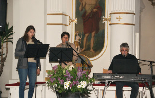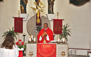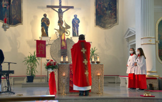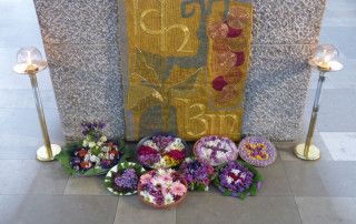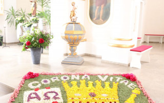 Herzlichen Dank an die Frauen für den wunderschön gestalteten Teppich mit dem Thema „CORONA VITAE“ und den Erstkommunionkindern für die blumengeschmückten Teller, die sie vor dem Altar abgestellt hatten.