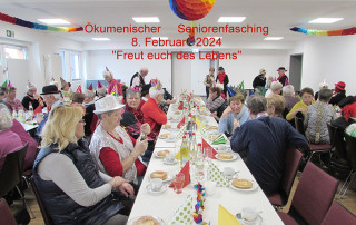Fröhliche Lieder zu Akkordeonklängen empfingen die überaus große Zahl an „behüteten“ Damen und Herren im Gemeindesaal St. Martin, die der Einladung der Seniorenbegegnung St. Mauritius und des evangelischen Seniorenclubs zum Fasching gefolgt waren. Nach der gereimten Begrüßung durch Erich Hoffmann duftete schon der Kaffee in den Tassen. Die dazu gereichten frischen Fastnachtsküchle schmeckten bei guter Unterhaltung besonders lecker. Danach sangen alle den Senioren-Faschingsschlager 2024 kräftig mit und das Stimmungsbarometer im Saal stieg an. Große Freude bereitete die Kindergruppe „Die tanzenden Schmetterlinge“, die bereits den Frauenbundfasching bereichert hatten. Mit kindlicher Leichtigkeit und zarten Flügelschlägen erweckten sie Frühlingsgefühle. Gabriele Teske sprach in ihrem Beitrag von „Schönen Augen“. Immer wieder erklang zwischen den Vorträgen Stimmungsmusik, die zum Schunkeln und Mitsingen animierte. Bärbele und ihr Babba entführten die Gäste in die „Wilhelma“, wo das Mädele (Annemarie Hoffmann) viele Fragen an ihren Papa (Anneliese Schäffler) hatte. Dieser zeigte sich leicht gereizt beim Benennen der Tiere und beim Unterscheiden von Schwanz, Flosse, Fuß und Rüssel. Die „Jagsttalperlen“, allesamt Damen des kath. Frauenbunds, suchten musikalisch nach einer Lösung, wo denn der ideale Mann zu finden sei, und dachten auch über eine Bestellung bei Zalando und Amazon nach. Von allen sehnsüchtig erwartet trat dann wie schon seit Jahren „Der Bauer vom Härtsfeld“, alias Erich Hoffmann, auf die Bühne. Gespickt mit viel Humor erzählte er von vielen Ereignissen des zurückliegenden Jahres, besonders von „seiner Babett“, wobei er die Lacher wieder auf seiner Seite hatte. Wieder waren es dann Frauenbund-Damen, die das Programm bereicherten. Begleitet von zwei „Ureinwohnern“ mit ihrem Didgeridoo, dem wohl ältesten Instrument Australiens, traten Kängurus mit einem Tanz auf die Bühne. Mit Dankesworten durch den Leiter der Seniorenbegegnung und dem Lied „So ein Tag, so wunderschön wie heute“ klang dieser schöne Nachmittag aus. Der letzte Satz aus dem Faschingsschlager wird noch lange nachhallen: „Die Gemeinschaft hat uns alle froh gestimmt, diese Freude jeder mit nach Hause nimmt.“