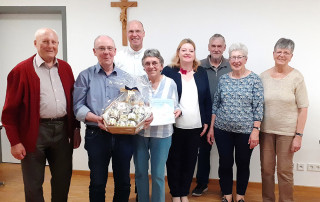 Seit dem Jahr 2012 hat Albert Klingler als Erster Vorsitzender „seines Kirchenchors“ große Verdienste erworben. In der Mitgliederversammlung am 8. April legte er dieses Amt nieder. Als  Dank und Anerkennung für sein jahrelanges Engagement wurde er mit der Ernennung zum Ehrenvorstand des Mauritiuschores überrascht. Pfarrer Matthias Reiner sprach den Dank der Kirchengemeinde aus und überreichte einen Geschenkkorb.  Der stellvertretende Vorsitzende Michael Wigger sprach in geschliffenen Worten vielfältigen Dank an den ausscheidenden Vorsitzenden Albert Klingler aus, ebenso an den dienst-ältesten Sänger und Beirat Josef Sauter mit seiner schönen und sicheren Bass-Stimme, an Pfarrer Reiner für die gute Zusammenarbeit und seine Wertschätzung, an die Schriftführerin, die Notenwartinnen, die Vorstandsmitglieder, an Josef Scheuriker als Nachsingstunden-Wirt und an alle, die sich in irgendeiner Weise für den Chor einbringen.
