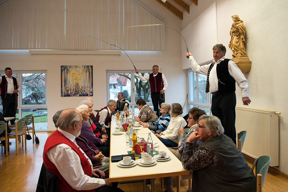 Da war mal was los. Irgendwann hatten wir die Absicht, bei einem Begegnungsnachmittag zu singen und dann, wie ein Zufall, ergab sich die Gelegenheit, dass die „Underschnoidamr Goiselschnalzer“ zu uns zu Besuch kamen.