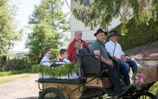 Im Anschluss wurde die zurückkehrende Prozession von einer Abordnung abgeholt. Um 11.00 Uhr wurde der gemeinsame Schlusssegen für Reiter und Besucher an der Altarinsel erteilt. Danach waren alle Reiter und Besucher vom Obst- und Gartenbauverein zu einem leckeren Mittagessen sowie Kaffee und Kuchen in die Turn- und Festhalle eingeladen. Zur Unterhaltung spielte das „Lauchheimer Echo“. Auch die Kinder sollten nicht zu kurz kommen. Es gab eine Kinderecke, wo gemalt und gebastelt wurde und auch Pferde Tattoos in tollen Farben aufgeklebt wurden. Im Garten von Frank Mornhinweg bot Miriam Josef ein Pony-Parcours an, über den sich die Kinder riesig freuten.