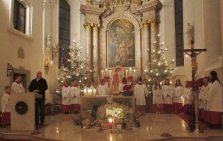Bereits am Spätnachmittag feierte eine große Zahl Gemeindemitglieder in der weihnachtlich geschmückten Kirche mit Pfarrer Reiner die Christmette. Als Auftakt sang der Kantor das Martyrologium, darin wird die Geburt Jesu nach verschiedenen Ereignissen der Heilsgeschichte und der Geschichte datiert. Eine große Zahl Ministranten zogen mit Kerzen in die Kirche ein und tauchten den Altarraum in ein stimmungsvolles Licht. Pfarrer Reiner sprach davon, dass alles Belastende, alles Trennende heute vor der Türe gelassen werden könne, um sich vom Kind Gottes, das in die Armseligkeit des menschlichen Lebens hineingeboren wurde, beschenken zu lassen.