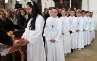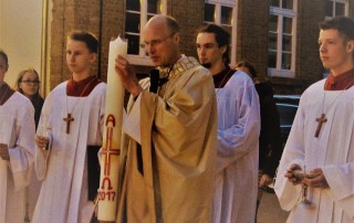 Um das knisternde Osterfeuer versammelten sich die Erstkommunionkinder am Abend des Karsamstags. Voller Erwartung durften sie ganz nah dabei sein, als Pfarrer Reiner das Feuer segnete und die neue Osterkerze daran entzündete. Dunkel war es, als man in die Kirche eintrat, bis allmählich das Licht der Osterkerze den Raum erhellte und an die vielen Kerzen der Gemeindemitglieder weitergegeben wurde. Die erste der biblischen Lesungen, der Schöpfungsbericht, wurde von Kommunionkindern vorgetragen. Verdeutlicht wurden die Texte durch große Bilder, welche die Kinder mit viel Engagement gemalt hatten und die für eine echte Bereicherung sorgten. Noch einmal wurden die Erstkommunionkinder im Gottesdienst besonders angesprochen, als sie nach der Allerheiligenlitanei ihre weißen Gewänder, die sie zur Erstkommunion tragen werden, in einer Geschenkbox mit goldener Schleife überreicht bekamen. Dieses Zeichen erinnert daran, dass in früherer Zeit die in der Osternacht Neugetauften bis zum „Weißen Sonntag“ ihre weißen Gewänder trugen. Zum Gloria setzte dann der große Osterjubel ein. Begleitet von Pauken, Trompeten und Streichern ließ der Kirchenchor unter der Leitung von Frau Maria Wolf das Halleluja von G.F. Händel erschallen. Die Glocken, die am Gründonnerstag verstummten, kündeten die Auferstehungsfreude und der Kirchenraum erstrahlte in voller Beleuchtung. Festlich erklangen aus der Mozartmesse KV 140 das Sanctus und das Agnus Dei, wobei der Chor vom Orchester begleitet wurde. Beim Verlassen der Kirche wünschten sich alle nach diesem festlichen Gottesdienst „Frohe und gesegnete Ostern“.
