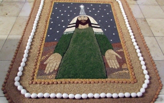 Angelehnt an das Bild von Sieger Köder zeigt der diesjährige Früchteteppichs in St. Mauritius Westhausen Abraham. Abraham ist betend dargestellt, den Blick zum Himmel gerichtet. Seine großen Hände sind leer, bereit und offen für Gottes Verheißung: „Schau zum Himmel hinauf und zähle die Sterne … So zahlreich werden deine Nachkommen sein.“