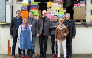 Unser Foto entstand bei der Anlieferung der Päckchen in der LEA (von links: Berthold Weiß LEA, Charlotte Raubach LEA, Laurent Marshall LEA, Pfarrer Matthias Reiner Westhausen, Dorothea Steidle Caritas, Anita Beck Caritas, Pfarrer Michael Windisch Ellwangen)