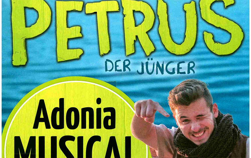Es gibt in der Bibel kaum eine schillerndere Person als Petrus. Das neue Adonia-Musical zeigt einfühlsam die Schwächen und Stärken des bedeutendsten Jüngers von Jesus. Über keinen anderen Jünger gibt es so viele Berichte und Zitate, die auch in der säkularen Kultur Bedeutung und Beachtung fanden. Ein begeisterndes und zugleich emotionales Musical über den Jünger Petrus, seine Freunde und über Jesus, ihren Lehrer, Freund und Gott.