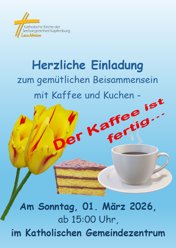 Herzliche Einladung zum gemütlichen Beisammensein mit Kaffee und Kuchen am Sonntag, 01. März 2026, ab 15:00 Uhr, im Katholischen Gemeindezentrum Lauchheim