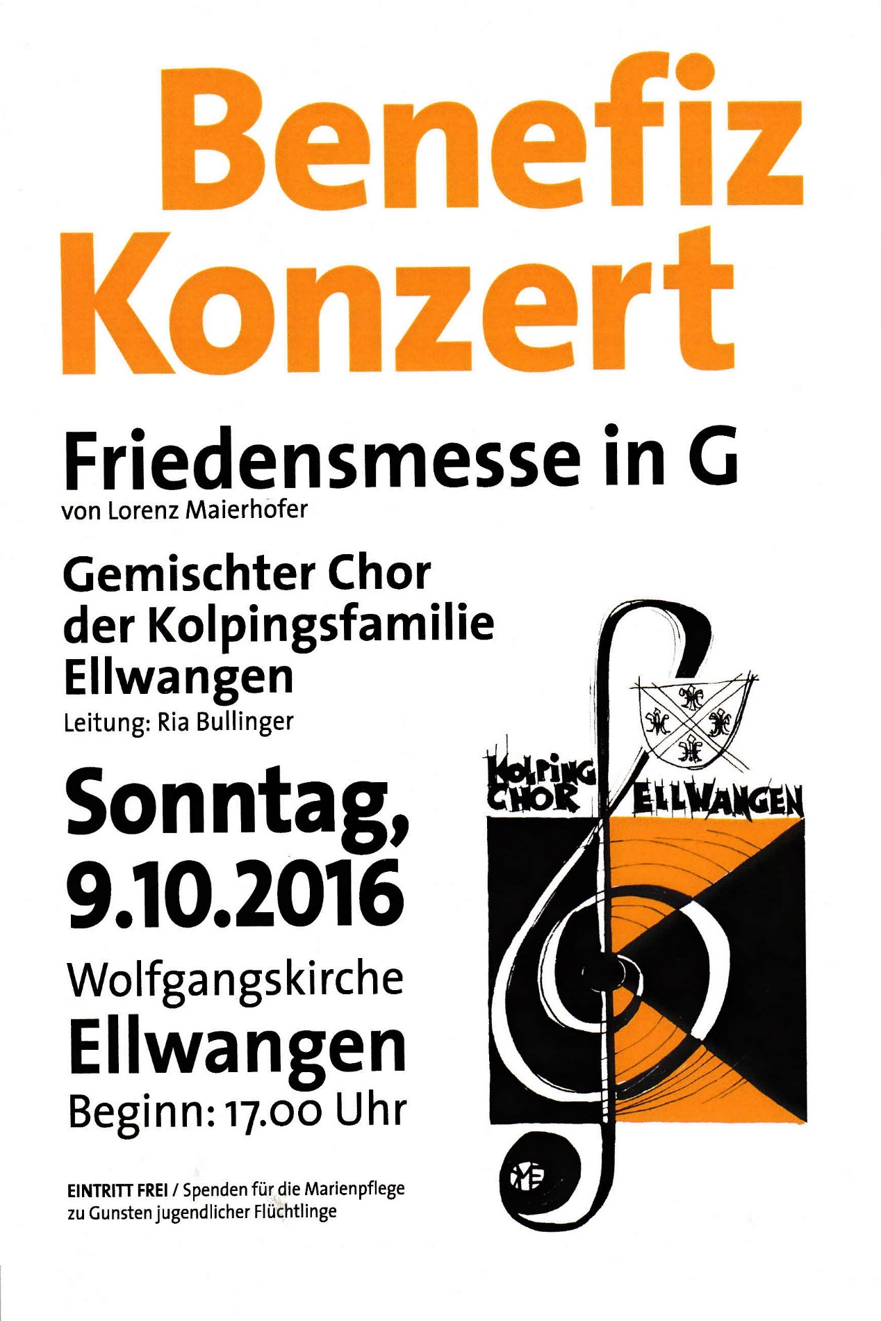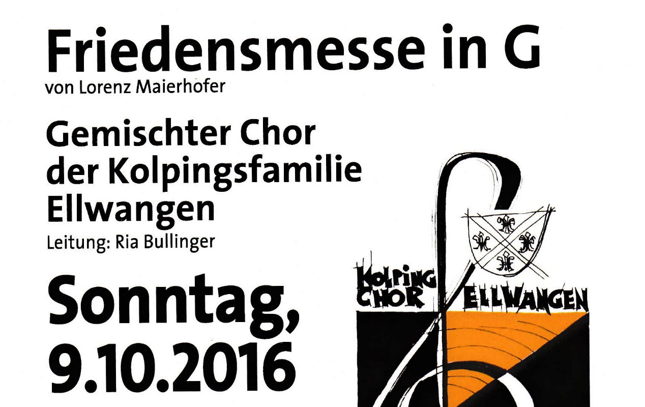 Der gemischte Chor der Kolpingsfamilie lädt herzlich zum Benefizkonzert zugunsten der Marienpflege für ihre Arbeit mit jugendlichen Flüchtlingen. Es kommt die Friedensmesse in G von Lorenz Maierhofer zur Aufführung.