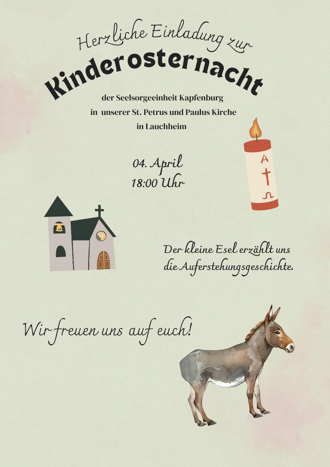Herzliche Einladung zur Kinderosternacht der Seelsorgeeinheit Kapfenburg in unserer St. Petrus und Paulus Kirche in Lauchheim, am 4. April um 18 Uhr.