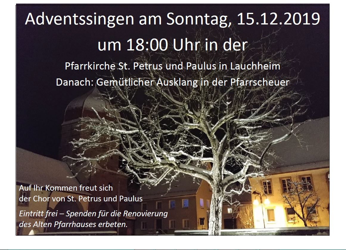 Am Sonntag, 15. Dezember um 18 Uhr lädt Sie der Chor von St. Petrus und Paulus ein zum Mitsingen von neuen und klassischen Adventsliedern.