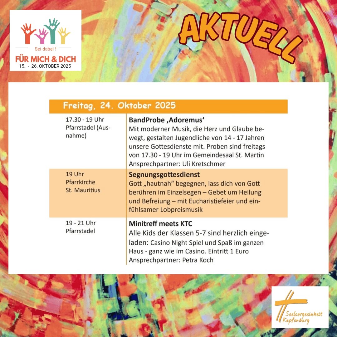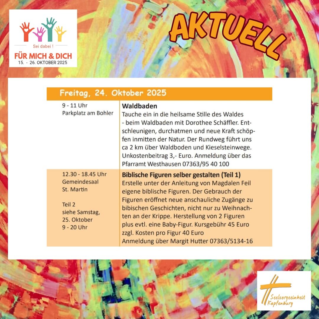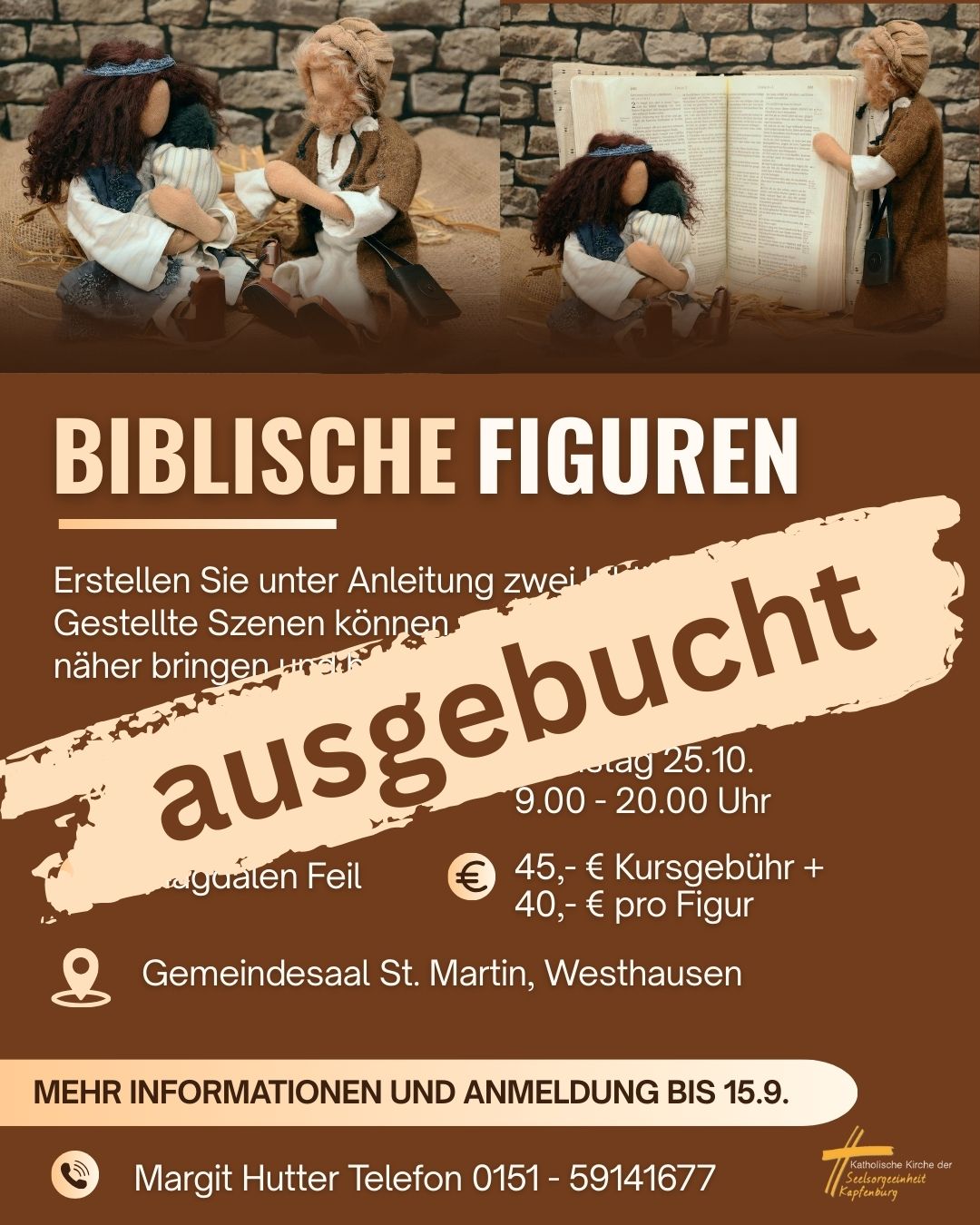 Erstellen Sie unter der Anleitung von Frau Magdalen Feil Ihre eigenen biblischen Figuren an zwei Arbeitstagen. Der Einsatz der Figuren eröffnet neue, anschauliche Zugänge zu biblischen Geschichten. Gestellte Szenen bringen uns die Botschaft Gottes näher, machen sie begreifbar. Durch das Bewegen der Figuren kommt in uns selbst etwas in Bewegung und erleichtert uns die Identifikation [...]