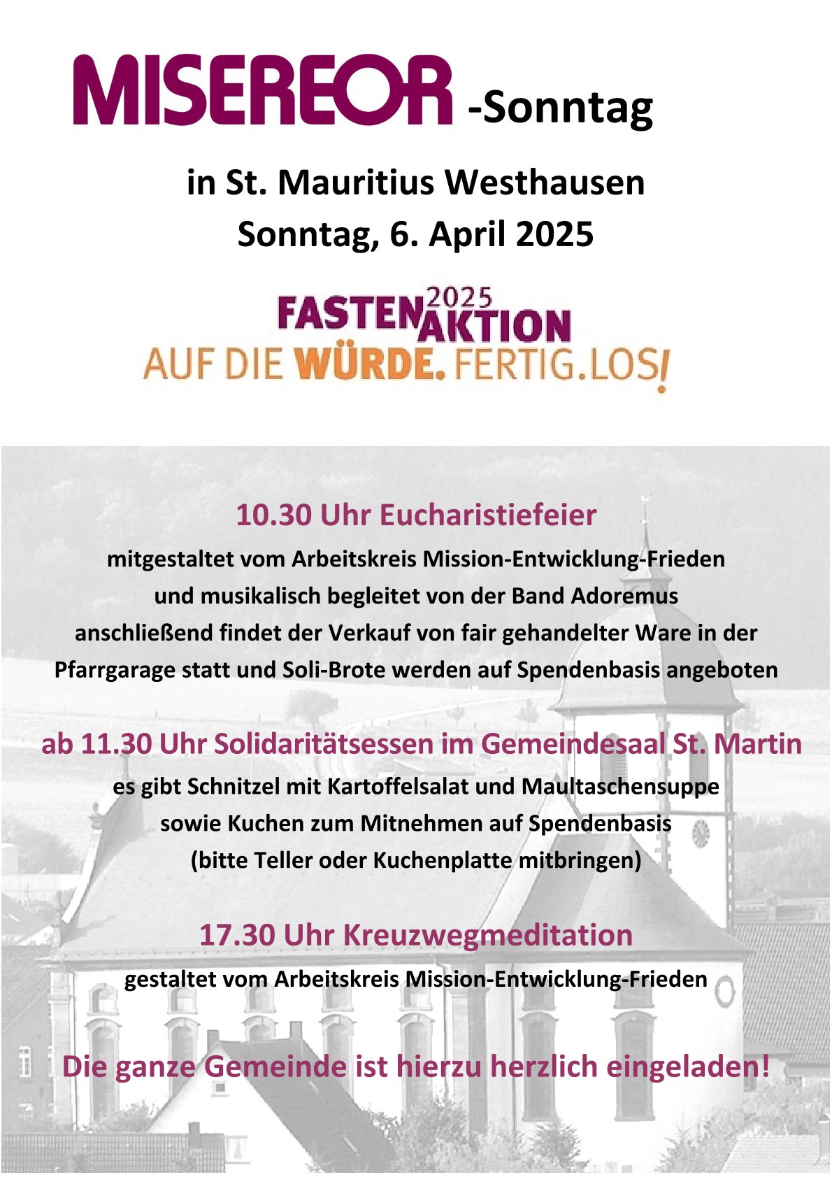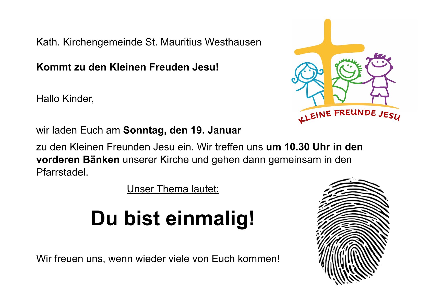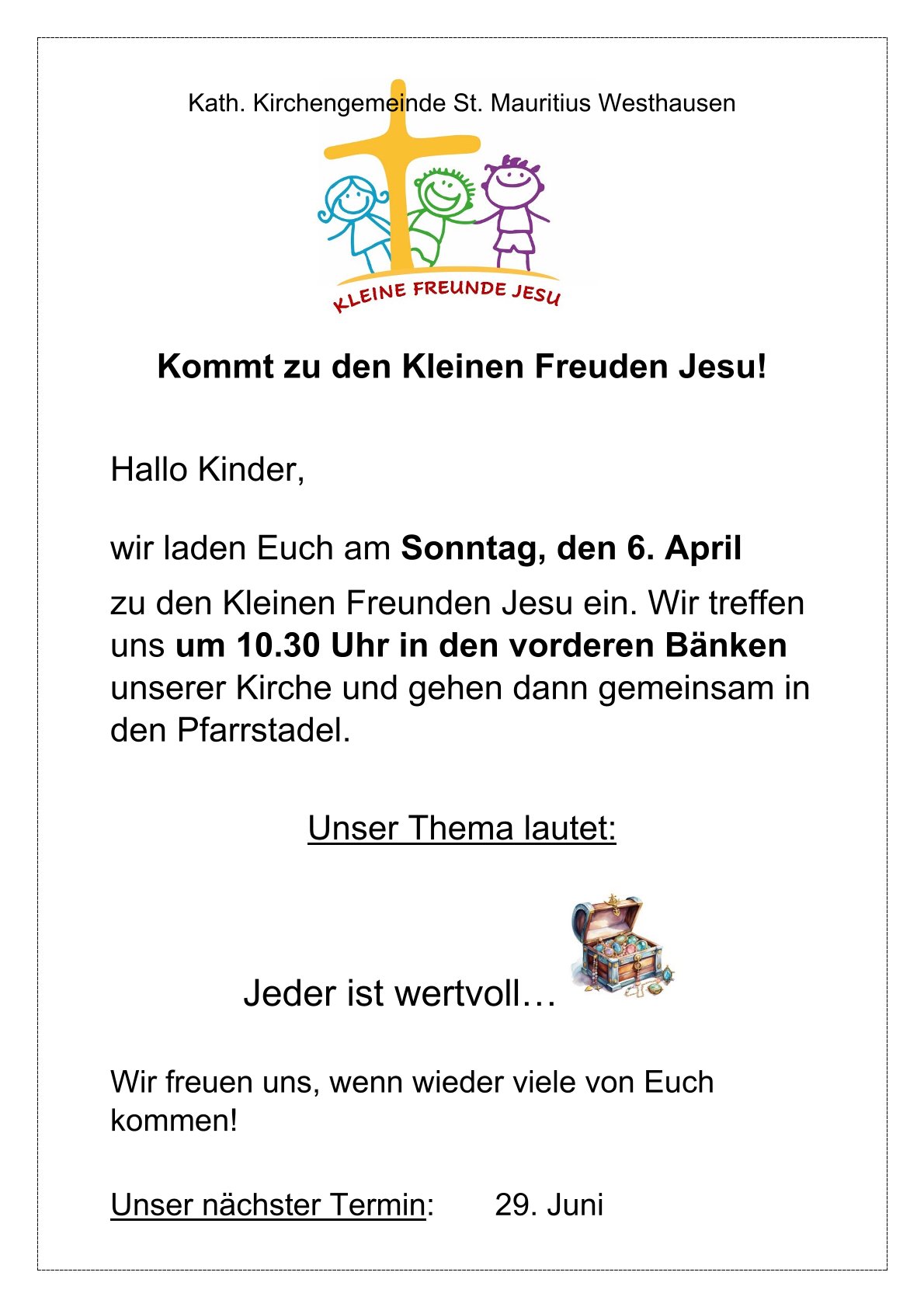 Pfarrkirche St. Mauritius Kirchplatz 9, WesthausenHallo Kinder, wir laden euch herzlich ein zur nächsten Kinderkirche am Sonntag, 16. Februar 2025 um 10.30 Uhr in der Pfarrkirche Westhausen. Zum Thema: „Fröhlich sein mit Gott“ wollen wir gemeinsam singen, beten, nachdenken und gestalten. Wir treffen uns in den vorderen Bänken der Pfarrkirche und gehen dann in den Pfarrstadel. Wir freuen uns auf [...]